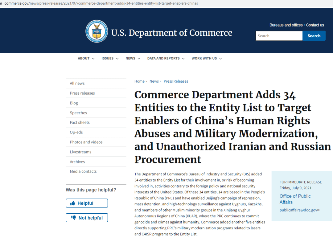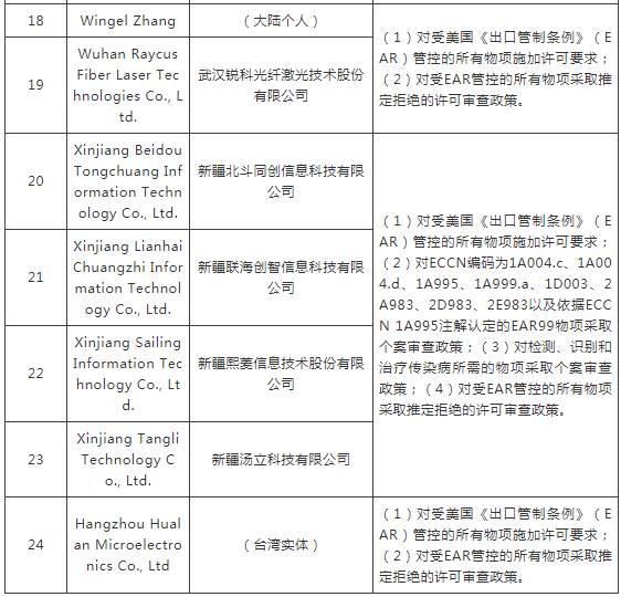 就在這個(gè)月的7月12日,美國商務(wù)部產(chǎn)業(yè)與安全局(BIS)通過《聯(lián)邦政府公報(bào)》(Federal Register)發(fā)布了一項(xiàng)最終規(guī)則(final rule),來自中國的24個(gè)實(shí)體/個(gè)人從事或促成了有違美國國家安全或外交政策利益的活動(dòng),因而將其列入“實(shí)體清單”。被列入清單的理由、列入后的許可要求和許可審查政策如下。