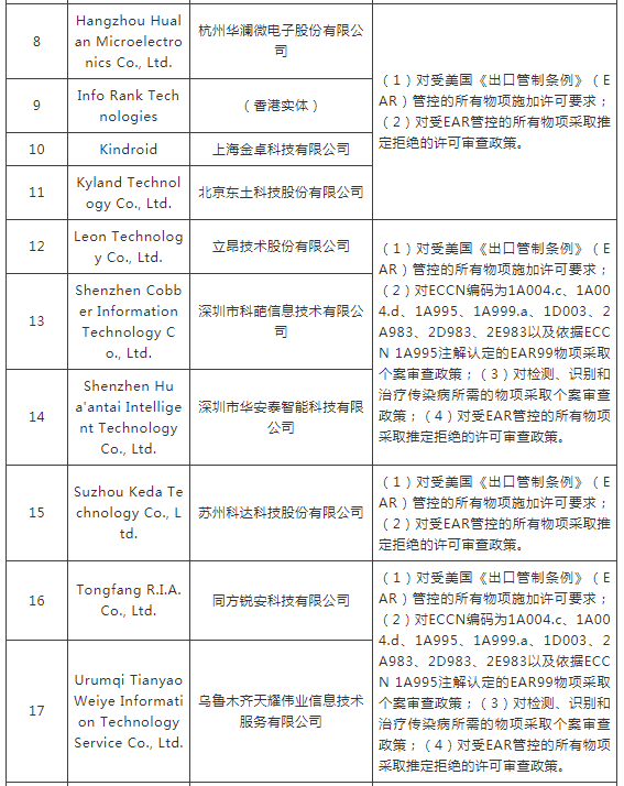 ERC認(rèn)定以下實(shí)體與所謂“中國在新疆的侵犯人權(quán)行動(dòng)”有牽連,違反美國外交政策,將其列入“實(shí)體清單”。