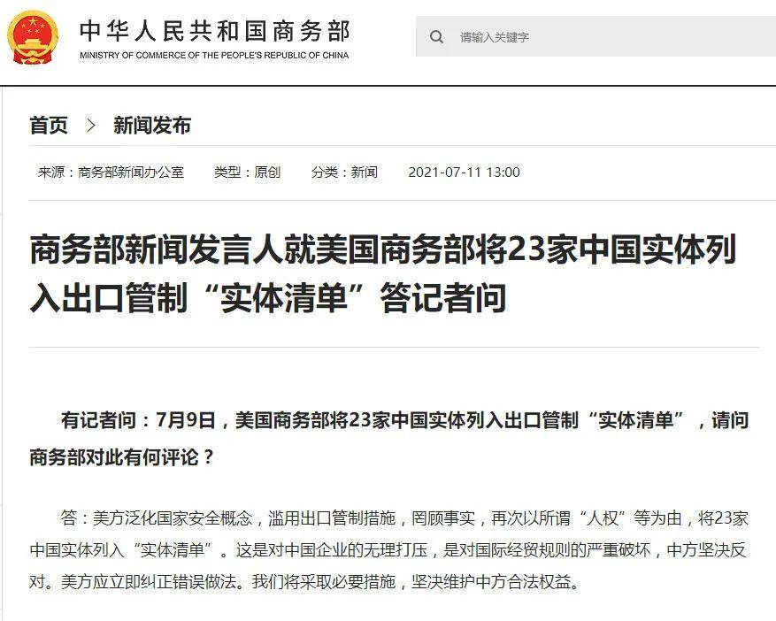 7月9日,商務(wù)部新聞發(fā)言人就美國商務(wù)部將23家中國實(shí)體列入出口管制“實(shí)體清單”答記者問:美方泛化國家安全概念,濫用出口管制措施,罔顧事實(shí),再次以所謂“人權(quán)”等為由,將23家中國實(shí)體列入“實(shí)體清單”。這是對中國企業(yè)的無理打壓,是對國際經(jīng)貿(mào)規(guī)則的嚴(yán)重破壞,中方堅(jiān)決反對。美方應(yīng)立即糾正錯(cuò)誤做法。我們將采取必要措施,堅(jiān)決維護(hù)中方合法權(quán)益。